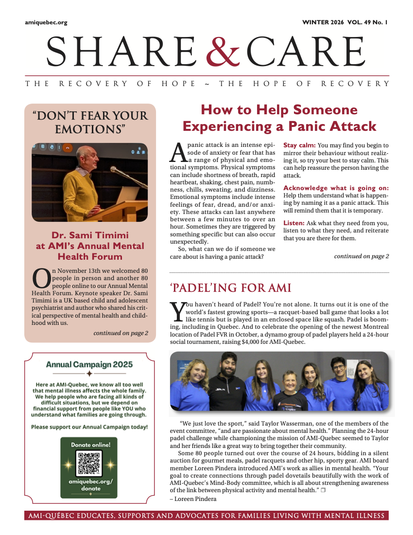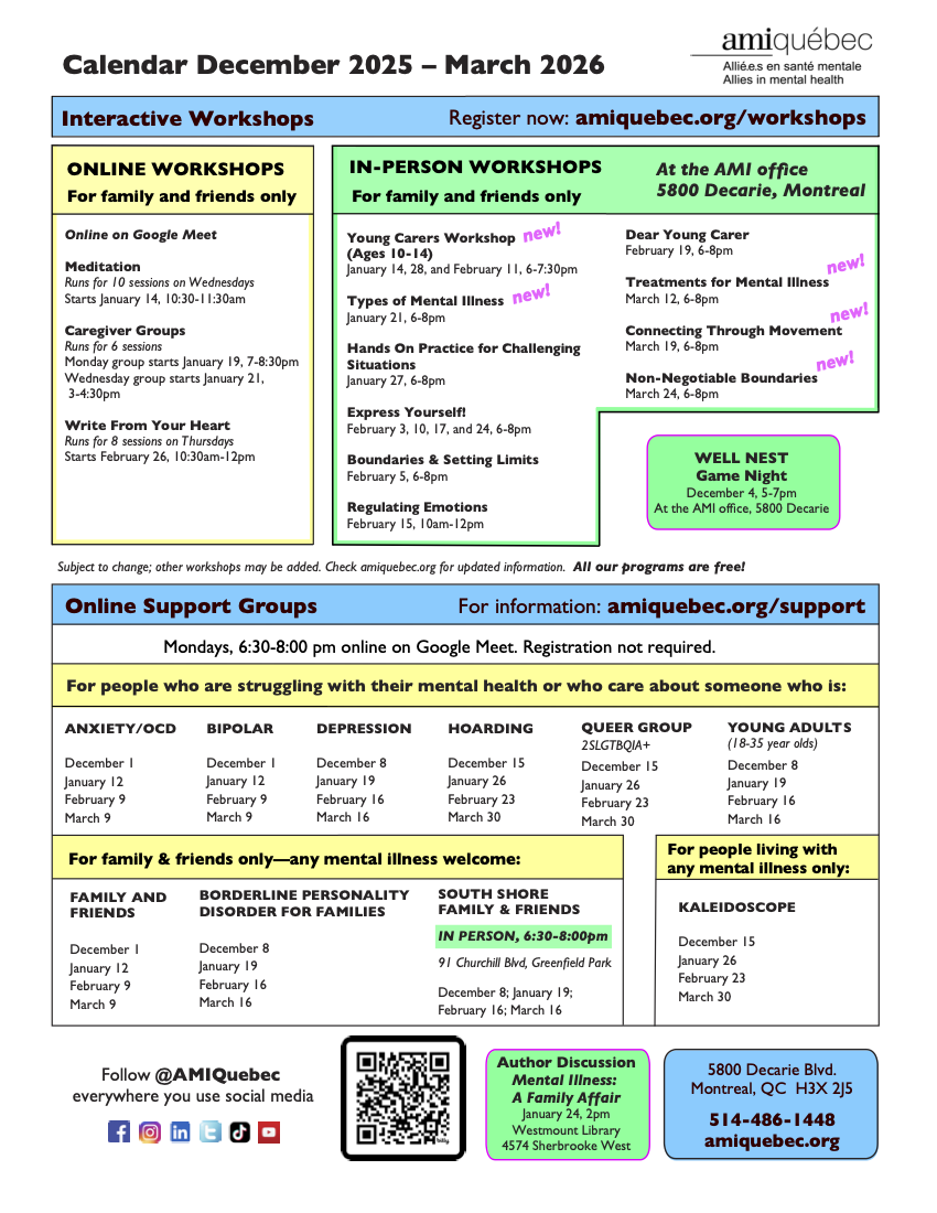 Please note: AMI-Quebec helps families cope with mental health problems and illnesses in a loved one. We are not a crisis centre; contact the organizations below for help.