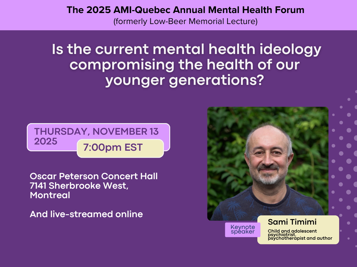AMI-Quebec is a non-profit organization that helps families manage the effects of mental illness through support, education, guidance, and advocacy. Our programs are free!